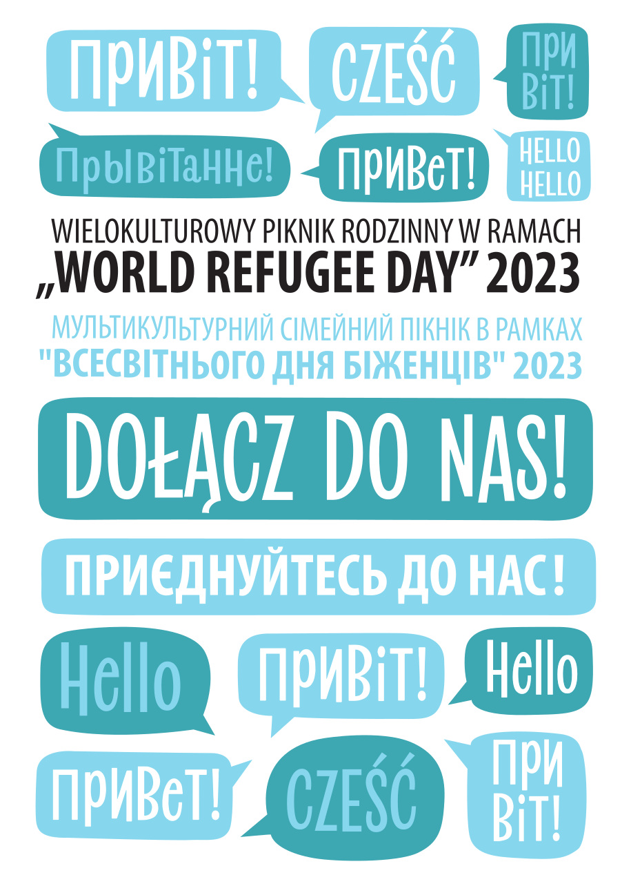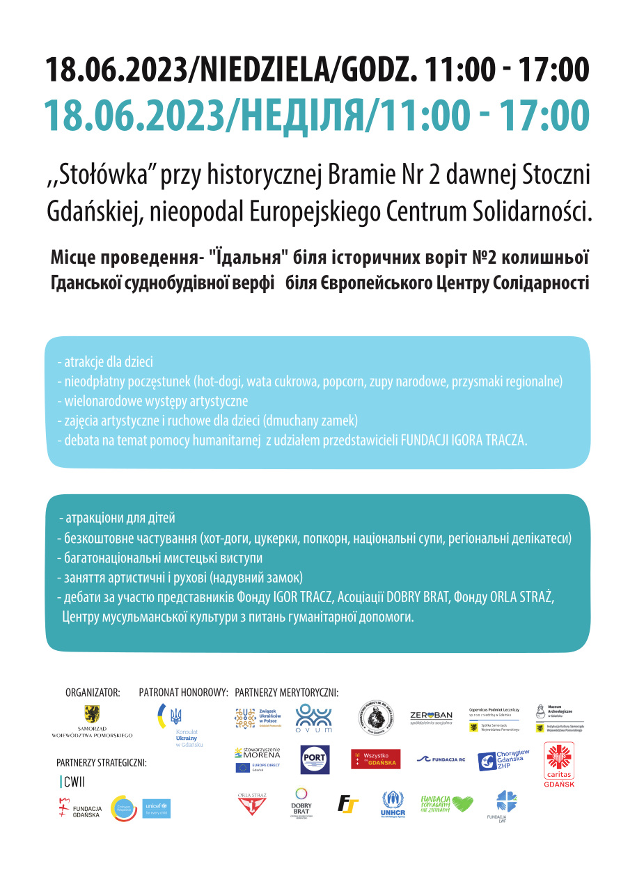 "Wielokulturowy piknik rodzinny w ramach World Refugge Day” – 18.06.2023 r. godz. 11.00 – 17.00 - brama nr 2 Stocznia Gdańskiej i Europejskiego Centrum Solidarności.