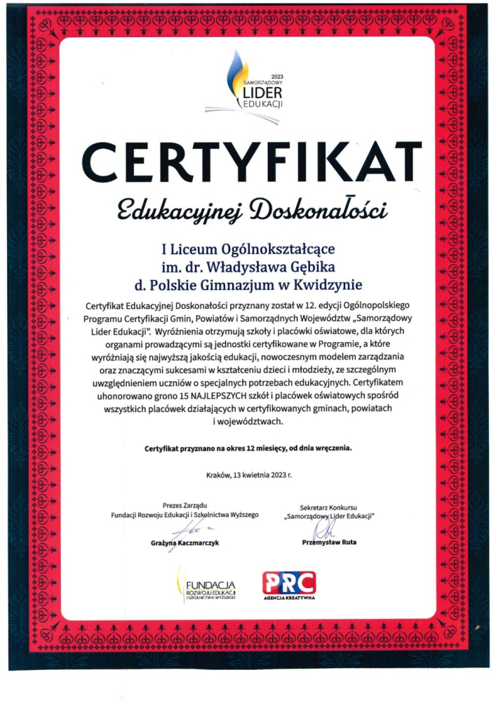 Ponadto, Pani Joanna Poźniak Dyrektor Zespołu Szkół Ogólnokształcących nr 1 w Kwidzynie odebrała certyfikat „Edukacyjnej Doskonałości” którym uhonorowano 15 NAJLEPSZYCH szkół i placówek oświatowych wyróżniających się najwyższą jakością edukacji, nowoczesnym modelem zarządzania oraz znaczącymi sukcesami w kształceniu dzieci i młodzieży, ze szczególnym uwzględnieniem uczniów o specjalnych potrzebach edukacyjnych.