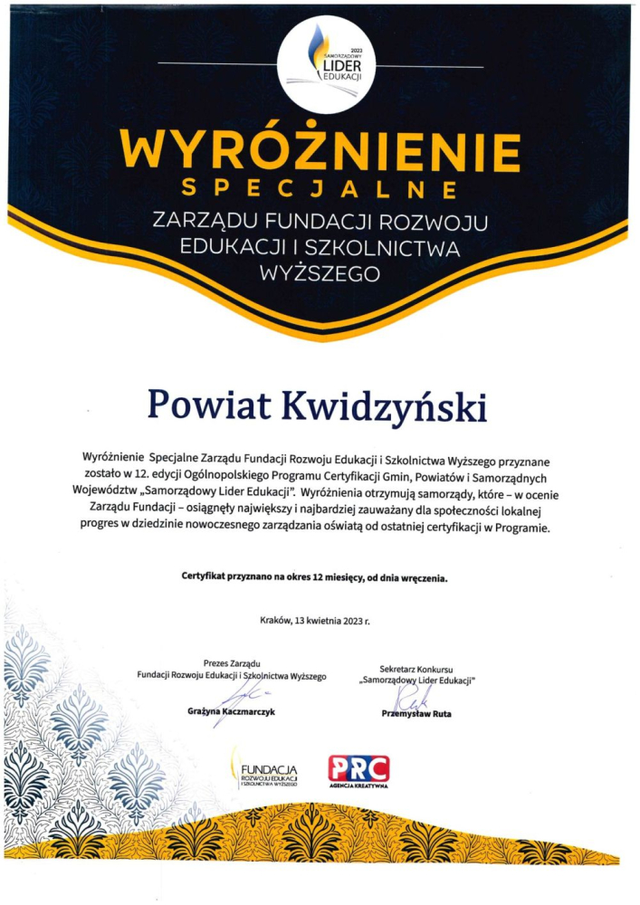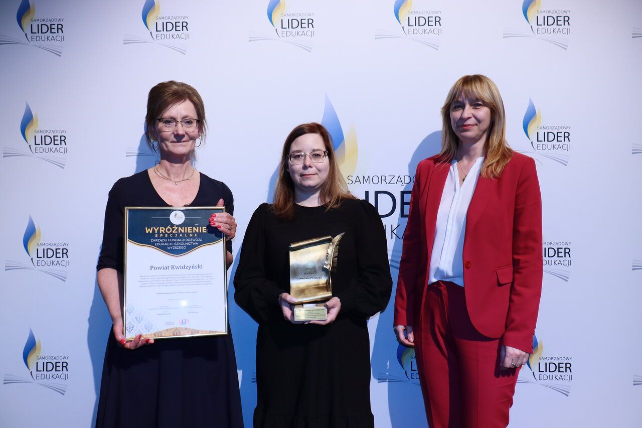 Z ramienia Starostwa Powiatowego w Kwidzynie w uroczystości udział wzięły: Anna Baranow – Pełnomocnik Starosty, Joanna Poźniak – Dyrektor Zespołu Szkół Ogólnokształcących nr 1 w Kwidzynie oraz Emilia Czupryniak – pracownik Wydziału Edukacji Kultury Sportu, Turystyki i Zdrowia Publicznego Starostwa Powiatowego w Kwidzynie. W tegorocznej edycji konkursu Powiat Kwidzyński uzyskał certyfikat „Samorządowy Lider Edukacji”, a także Wyróżnienie Specjalne Zarządu Fundacji Rozwoju Edukacji i Szkolnictwa Wyższego, które zostało przyznane tym JST, które osiągnęły największy i najbardziej zauważalny dla społeczności lokalnej progres w dziedzinie nowoczesnego zarządzania oświatą od ostatniej certyfikacji.
