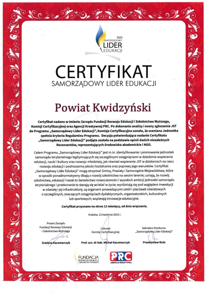 Powiat Kwidzyński otrzymał także certyfikat „Lider wśród Liderów”, wręczany tym samorządom, które uzyskały wyróżnienie „Samorządowy Lider Edukacji” po raz dziewiąty, potwierdzający, iż realizowany przez Powiat innowacyjny i progresywny model polityki oświatowej ma charakter strategiczny, cechuje się wieloletnią trwałością i jest traktowany przez władze powiatu w sposób priorytetowy.