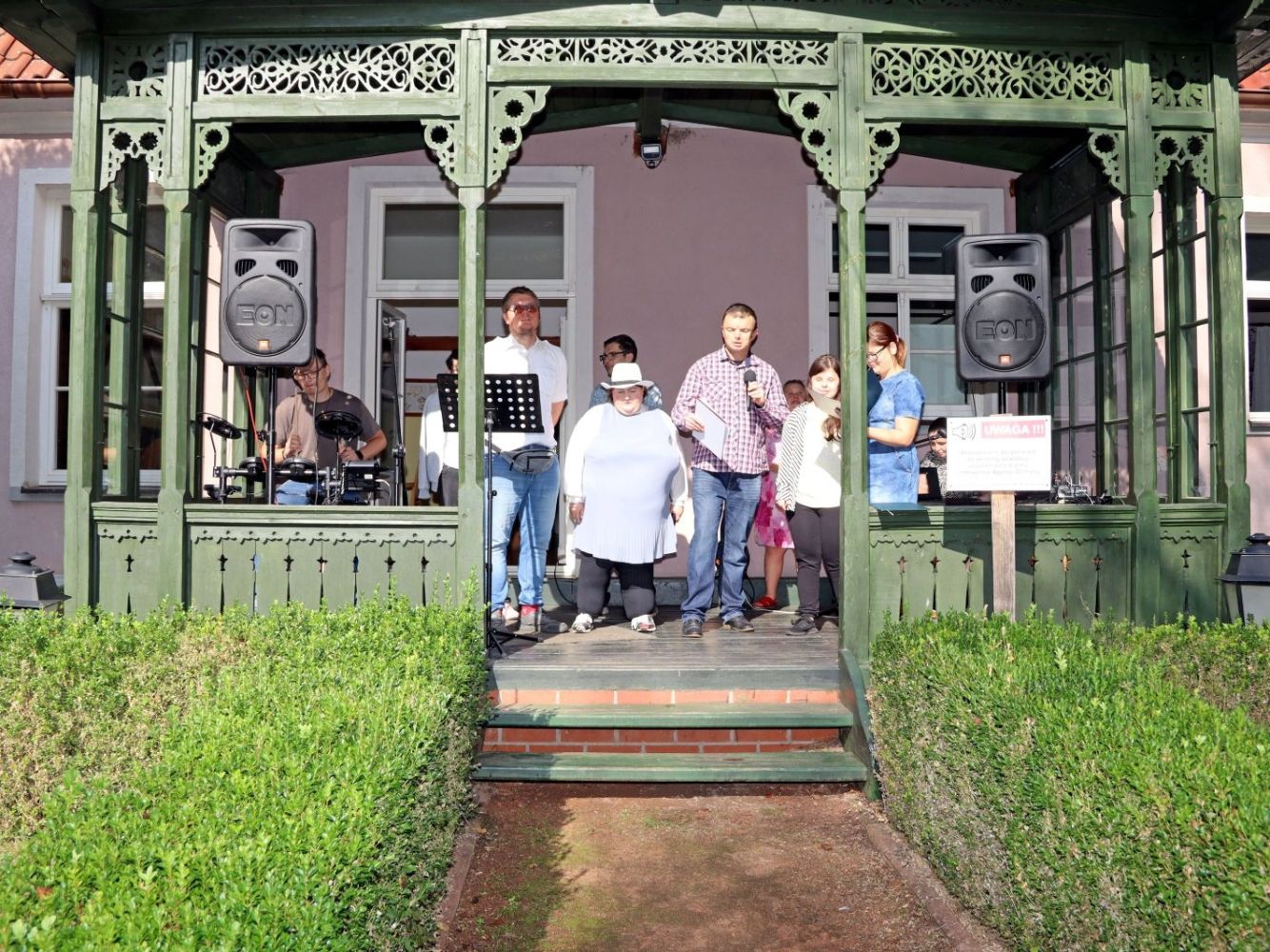 Zdjęcie przedstawia grupę muzyków stojących na werandzie, w tle widać perkusję, z przodu mężczyzna trzyma w ręku mikrofon, obok niego stoi kobieta w kapeluszu