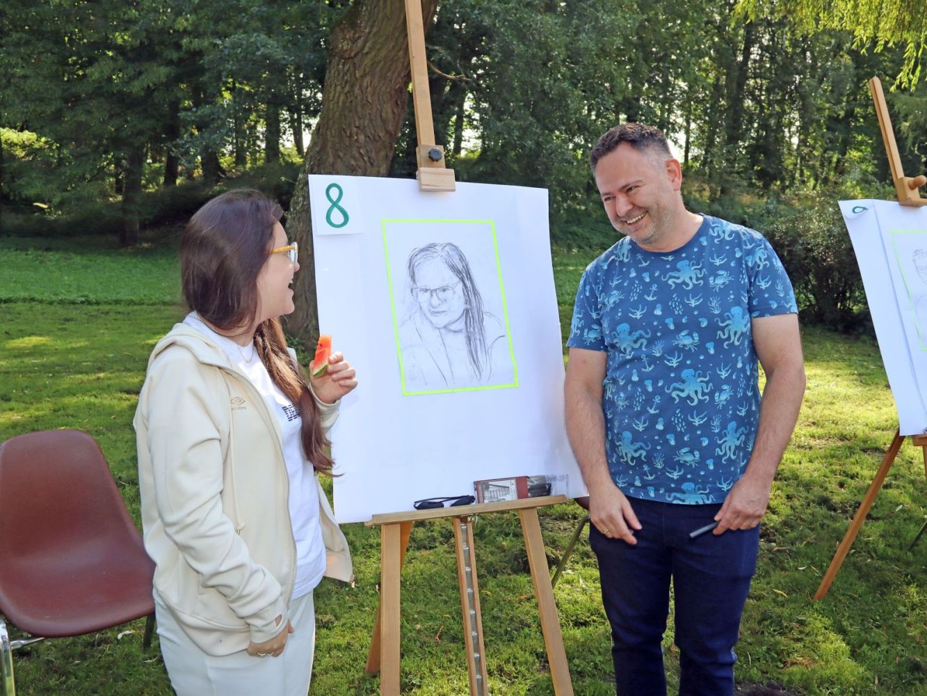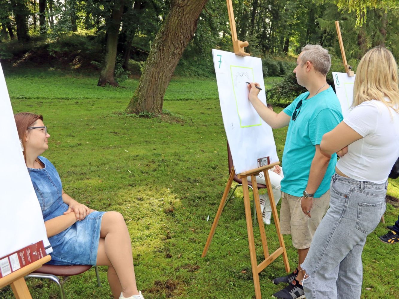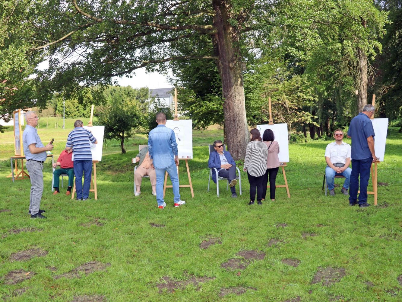 Zdjęcie przedstawia plener malarski; na krzesłach siedzą modele, przy sztalugach stoją malarze; w tle drzewa i trawa