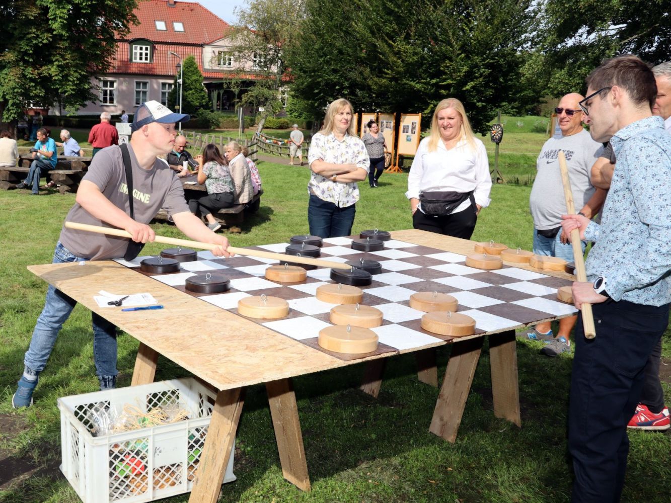 Zdjęcie przedstawia grupę ludzi podczas pikniku; na pierwszym planie widać dwóch grających w wielkie warcaby