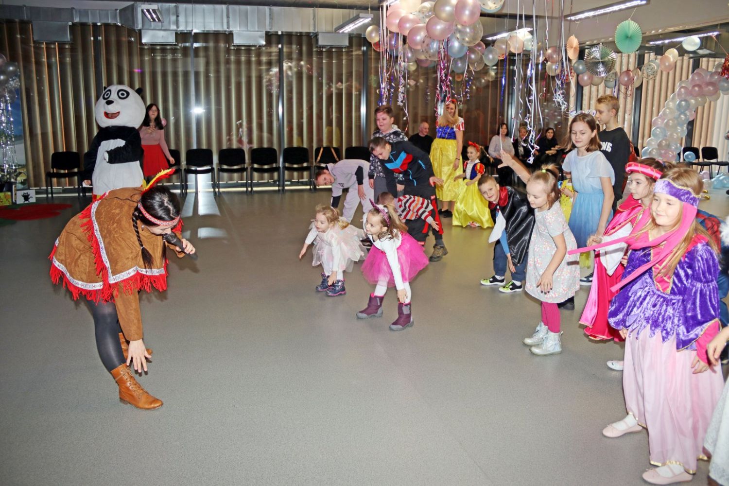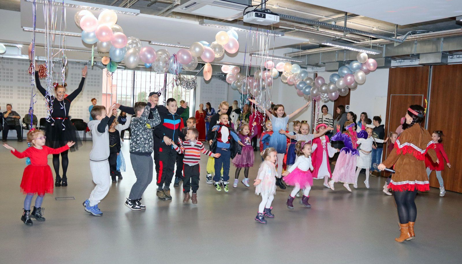 Animatorzy bawią się z dziećmi, które radośnie uczestniczą w karnawałowych zabawach.