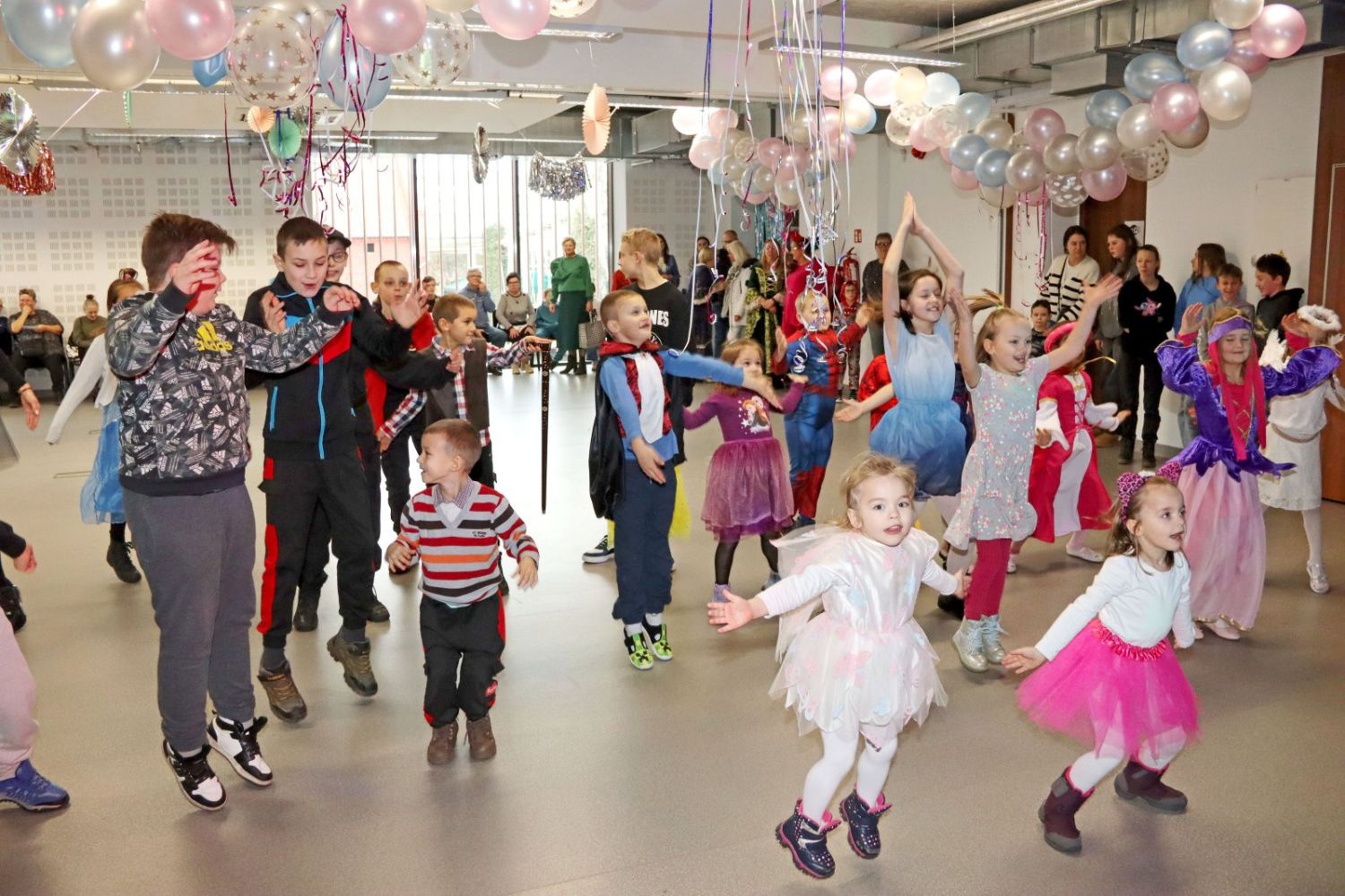 Dzieci tańczą, skacząc w rytm muzyki, pełne energii i radości podczas balu karnawałowego.
