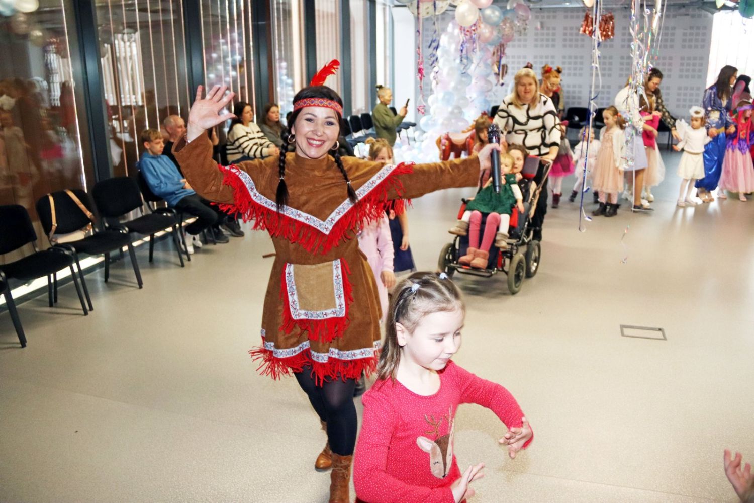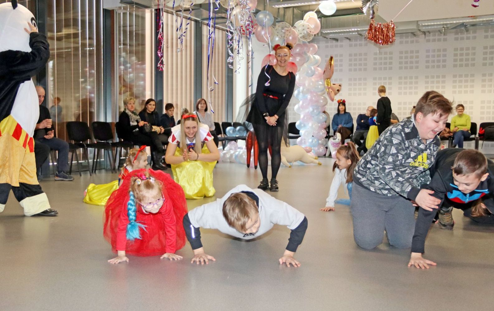 Animatorzy bawią się z dziećmi, które pełne entuzjazmu biorą udział w karnawałowych zabawach.