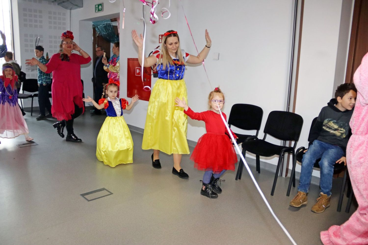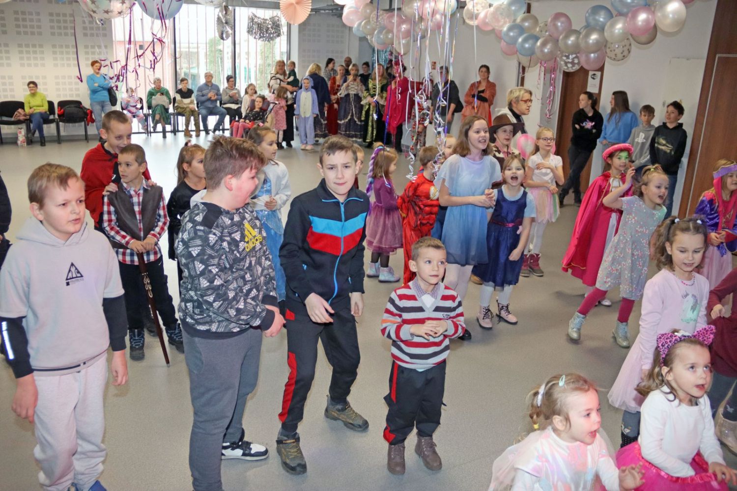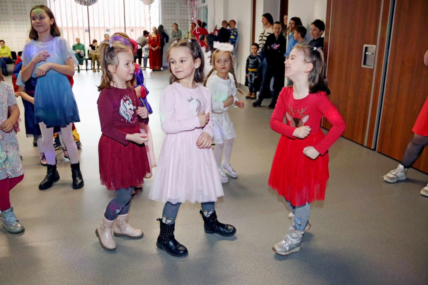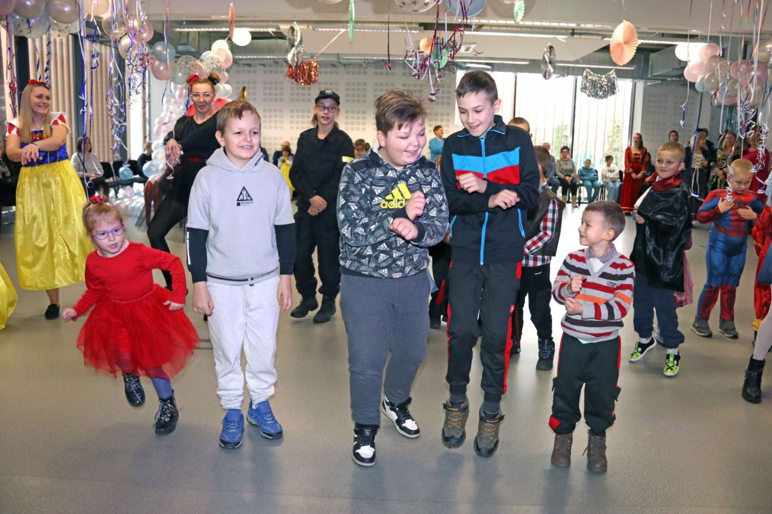 Dzieci tańczą wesoło w rytm muzyki, ciesząc się karnawałową zabawą.