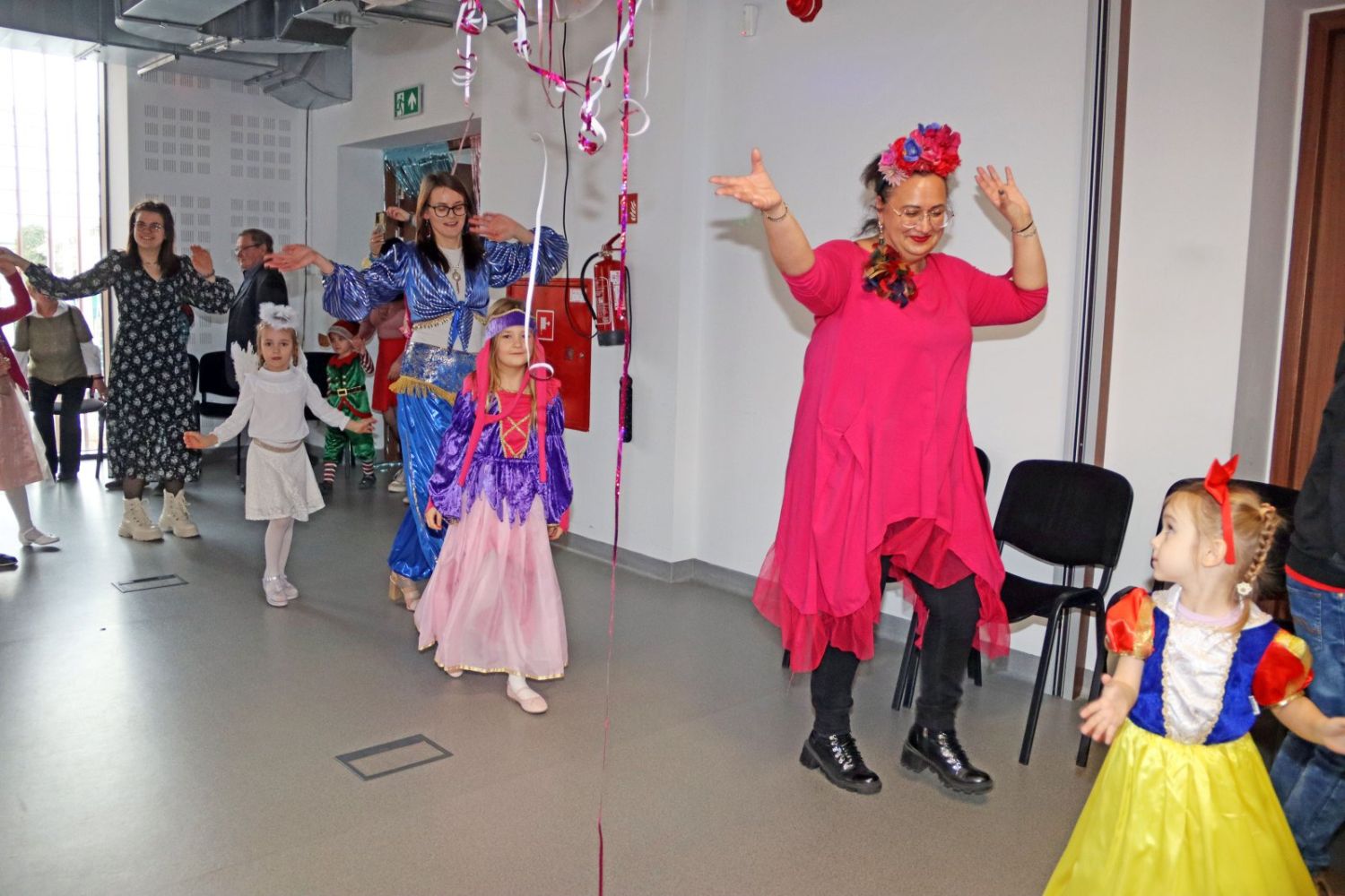 Dzieci i animatorzy wspólnie bawią się w rytm muzyki, ciesząc się karnawałowym szaleństwem.