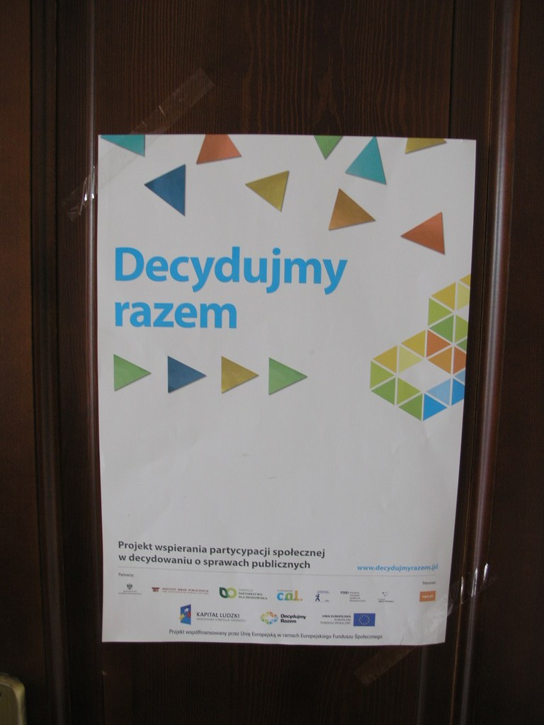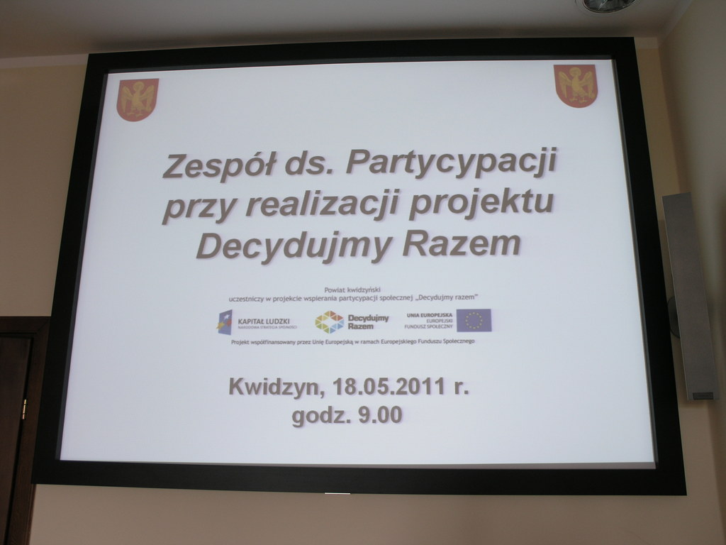 W dniu 18.05.2011 r. w Starostwie Powiatowym w Kwidzynie odbyło się drugie posiedzenie Zespołu ds. partycypacji w ramach realizacji projektu systemowego Decydujmy Razem. Wzmocnienie mechanizmów partycypacyjnych w kreowaniu i wdrażaniu polityk publicznych oraz podejmowaniu decyzji publicznych realizowanego w ramach Działania 5.3 Wsparcie na rzecz realizacji Strategii Lizbońskiej, Priorytetu V Dobre rządzenie w ramach Programu Operacyjnego Kapitał Ludzki współfinansowanego z Europejskiego Funduszu Społecznego.