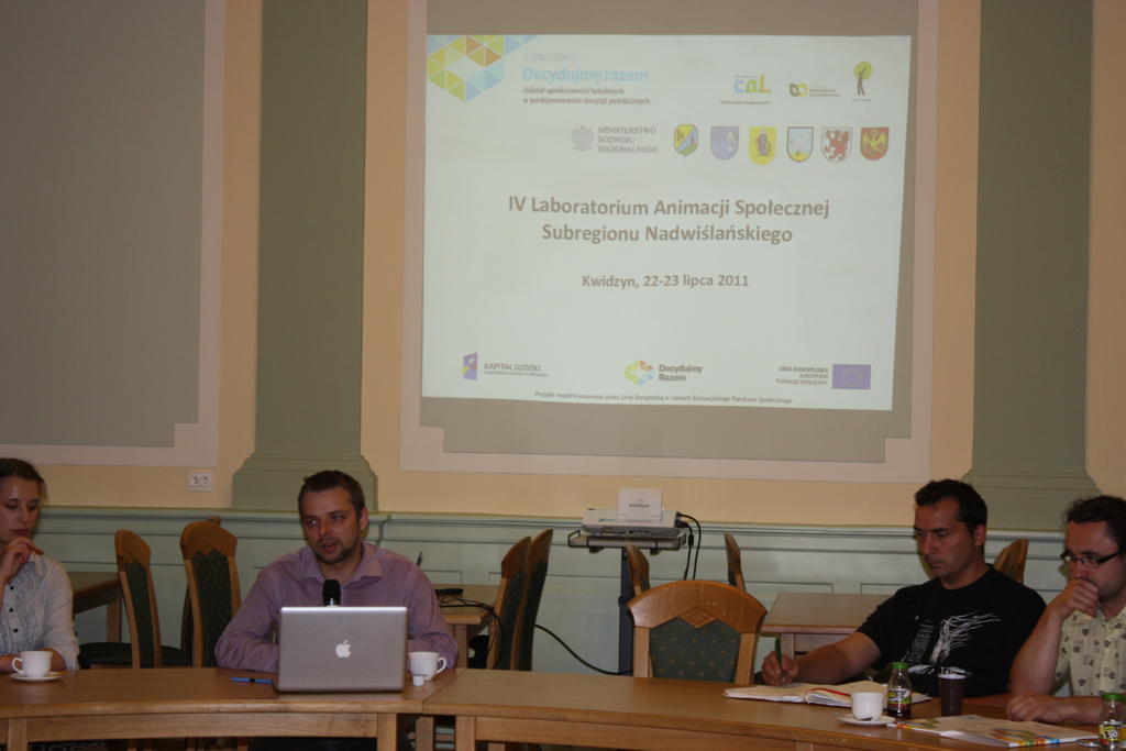W dniu 22.07.2011 r. w Urzędzie Miasta Kwidzyn odbyło się kolejne spotkanie Laboratorium Animacji Społecznej przy realizacji projektu systemowego Decydujmy Razem. Wzmocnienie mechanizmów partycypacyjnych w kreowaniu i wdrażaniu polityk publicznych oraz podejmowaniu decyzji publicznych realizowanego w ramach Działania 5.3 Wsparcie na rzecz realizacji Strategii Lizbońskiej, Priorytetu V Dobre rządzenie w ramach Programu Operacyjnego Kapitał Ludzki współfinansowanego z Europejskiego Funduszu Społecznego.
