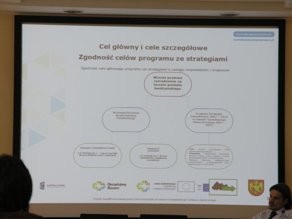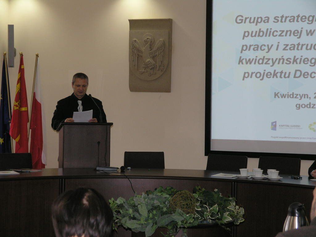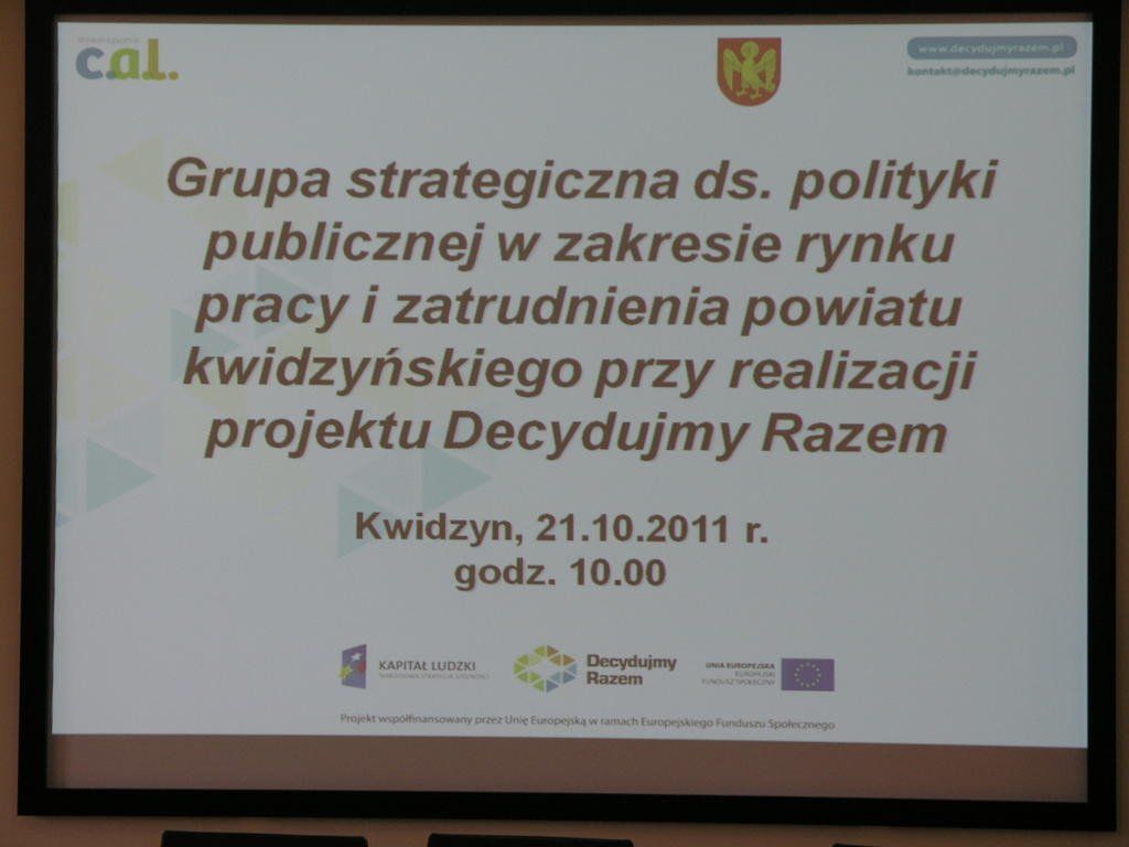 W dniu 21.10.2011 r. w Starostwie Powiatowym w Kwidzynie odbyło się trzecie spotkanie Grupy strategicznej do spraw polityki publicznej w zakresie rynku pracy i zatrudnienia powiatu kwidzyńskiego w ramach realizacji projektu systemowego Decydujmy razem. Wzmocnienie mechanizmów partycypacyjnych w kreowaniu i wdrażaniu polityk publicznych oraz podejmowaniu decyzji publicznych realizowanego w ramach Działania 5.3 Wsparcie na rzecz realizacji Strategii Lizbońskiej, Priorytetu V Dobre rządzenie w ramach Programu Operacyjnego Kapitał Ludzki współfinansowanego z Europejskiego Funduszu Społecznego.