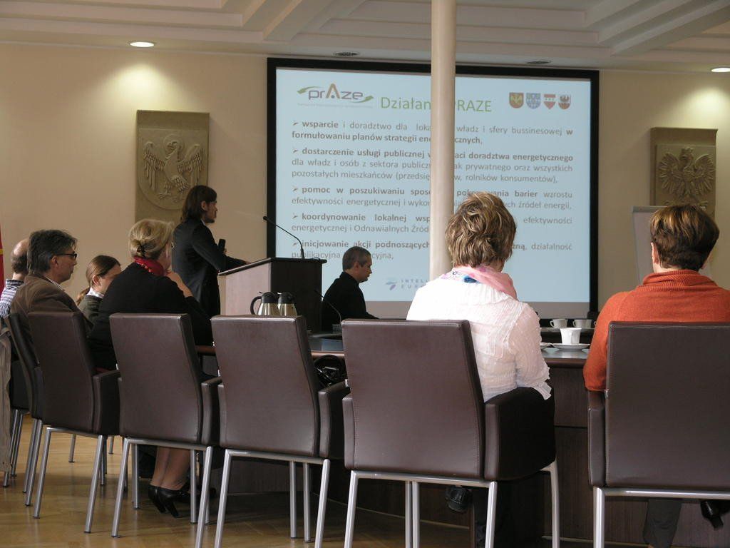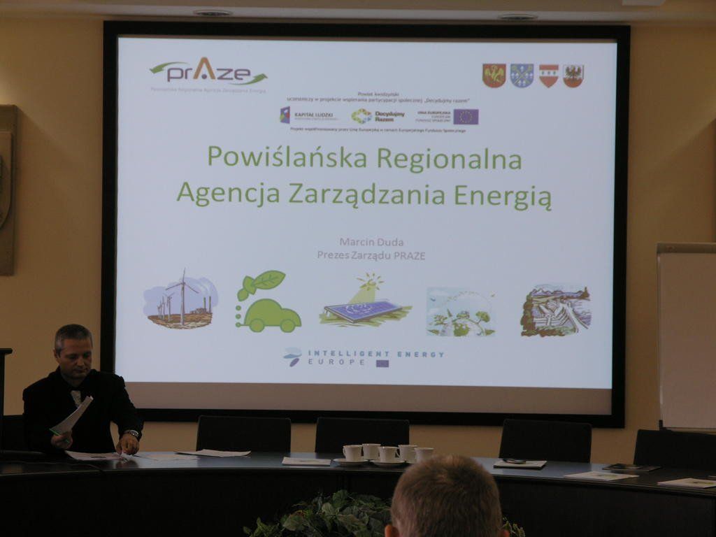 Pierwszą prezentację przedstawił Marcin Duda ? Prezes Zarządu Stowarzyszenia Powiślańska Regionalna Agencja Zarządzania Energią w Górkach pn. Działalność Powiślańskiej Regionalnej Agencji Zarządzania Energią w Górkach. Zapoznał zebranych z historią powstania stowarzyszenia, partnerami oraz działaniami prowadzonymi przez PRAZE.
