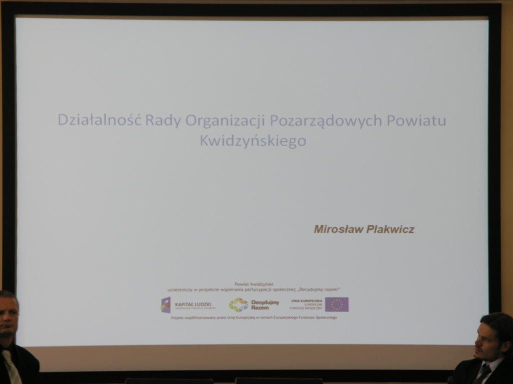 Drugi temat, który omówił Mirosław Plakwicz to Przedstawienie działalności Rady Organizacji Pozarządowych Powiatu Kwidzyńskiego. Poinformował zebranych, iż pełni on funkcję Przewodniczącego Rady Organizacji Pozarządowych Powiatu Kwidzyńskiego. Zapoznał zebranych z : istotą, celami Rady, z listą członków Rady, pracami oraz podejmowanymi działaniami przez Radę.