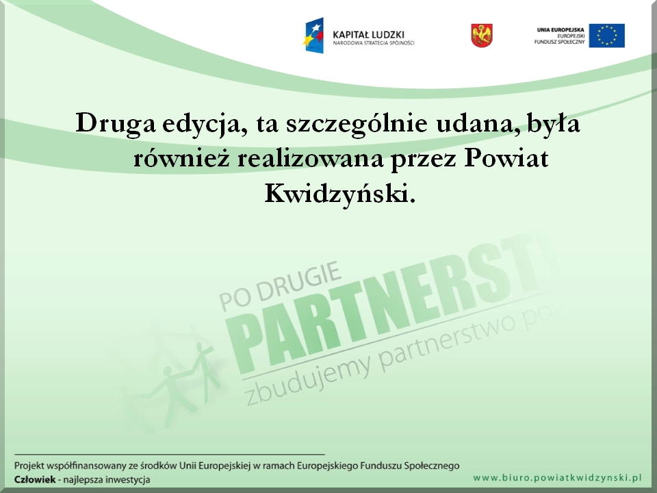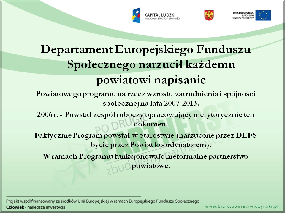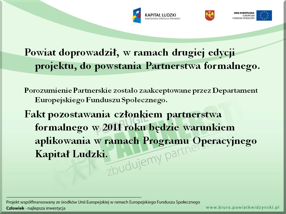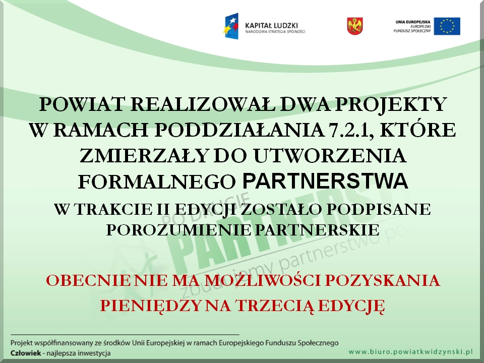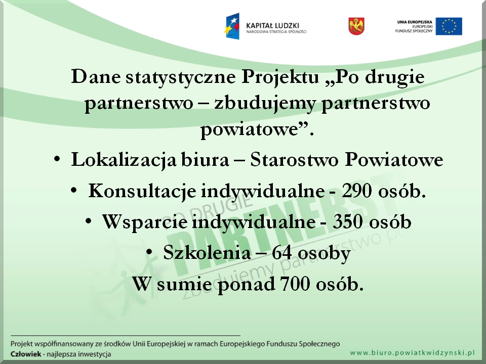 Informacja o projekcie ?Po drugie partnerstwo ? zbudujemy partnerstwo powiatowe? realizowanego w ramach Działania 7.2 Przeciwdziałanie wykluczeniu i wzmocnienie sektora ekonomii społecznej, Poddziałania 7.2.1 Aktywizacja zawodowa i społeczna osób zagrożonych wykluczeniem społecznym.