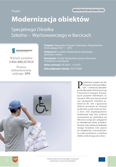 Jednym z prezentowanych w w/w opracowaniu jest projekt Modernizacja obiektów Specjalnego Ośrodka Szkolno ? Wychowawczego w Barcicach, współfinansowany przez Unię Europejską z Europejskiego Funduszu Rozwoju Regionalnego w ramach Regionalnego Programu Operacyjnego dla Województwa Pomorskiego na lata 2007-2013, Oś Priorytetowa 9 Lokalna infrastruktura społeczna i inicjatywy obywatelskie, Działania 9.1. Lokalna infrastruktura edukacyjna, sportowa i kultury.