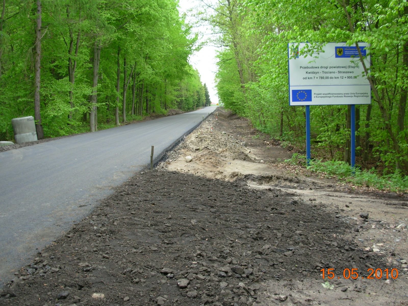 Trwają prace budowlane w ramach projektu Przebudowa drogi powiatowej ( Etap II ) Kwidzyn?Trzciano-Straszewo od km 7+780,00 do km 12+900,00, współfinansowanego przez Unię Europejską z Europejskiego Funduszu Rozwoju Regionalnego w ramach Regionalnego Programu Operacyjnego dla Województwa Pomorskiego na lata 2007-2013, Oś Priorytetowa 8 Lokalna infrastruktura podstawowa, Działanie 8.1 Lokalny potencjał rozwojowy, Poddziałanie 8.1.1 Lokalna infrastruktura drogowa.