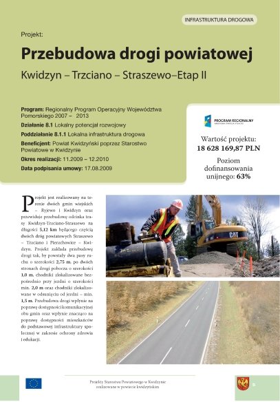 Jednym z prezentowanych w w/w opracowaniu jest projekt Przebudowa drogi powiatowej ( Etap II ) Kwidzyn?Trzciano-Straszewo od km 7 + 780,00 do km 12+900,00 , współfinansowany przez Unię Europejską z Europejskiego Funduszu Rozwoju Regionalnego w ramach Regionalnego Programu Operacyjnego dla Województwa Pomorskiego na lata 2007-2013, Oś Priorytetowa 8 Lokalna infrastruktura podstawowa, Działanie 8.1 Lokalny potencjał rozwojowy, Poddziałanie 8.1.1 Lokalna infrastruktura drogowa.